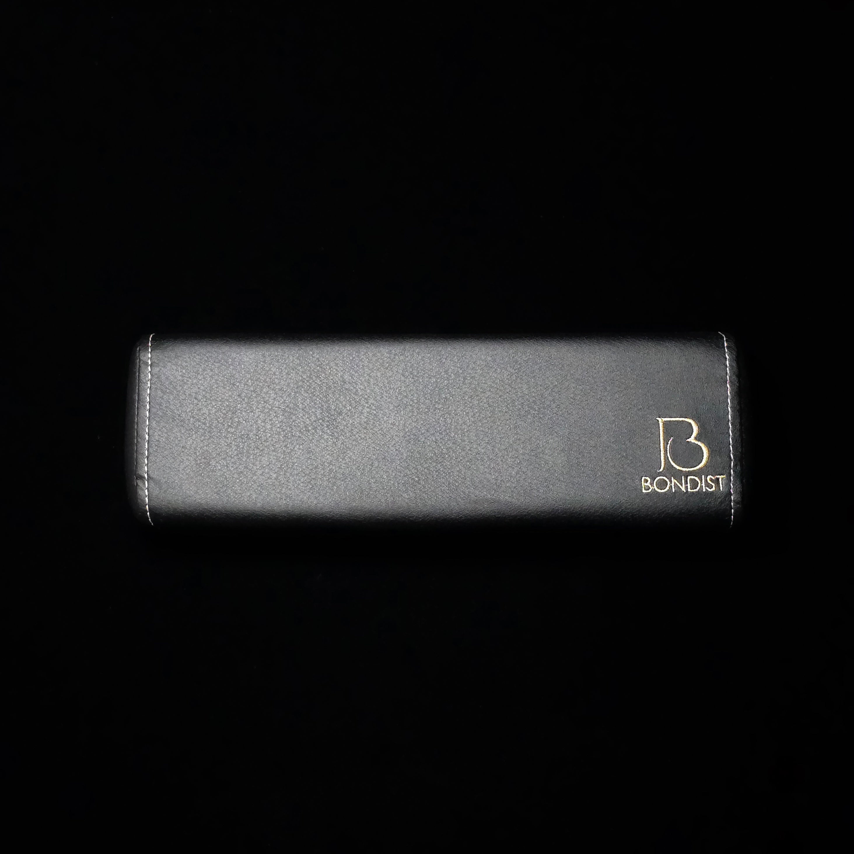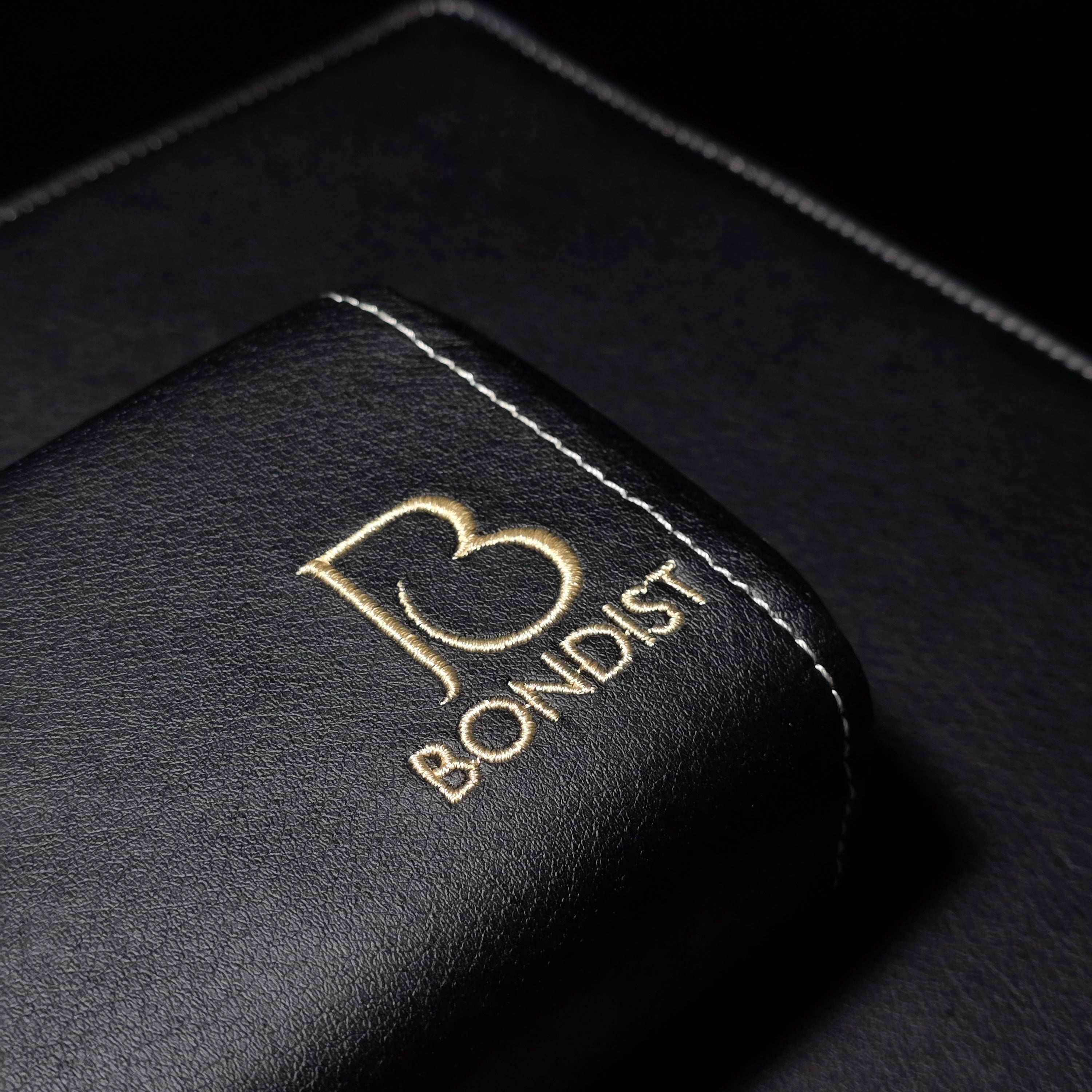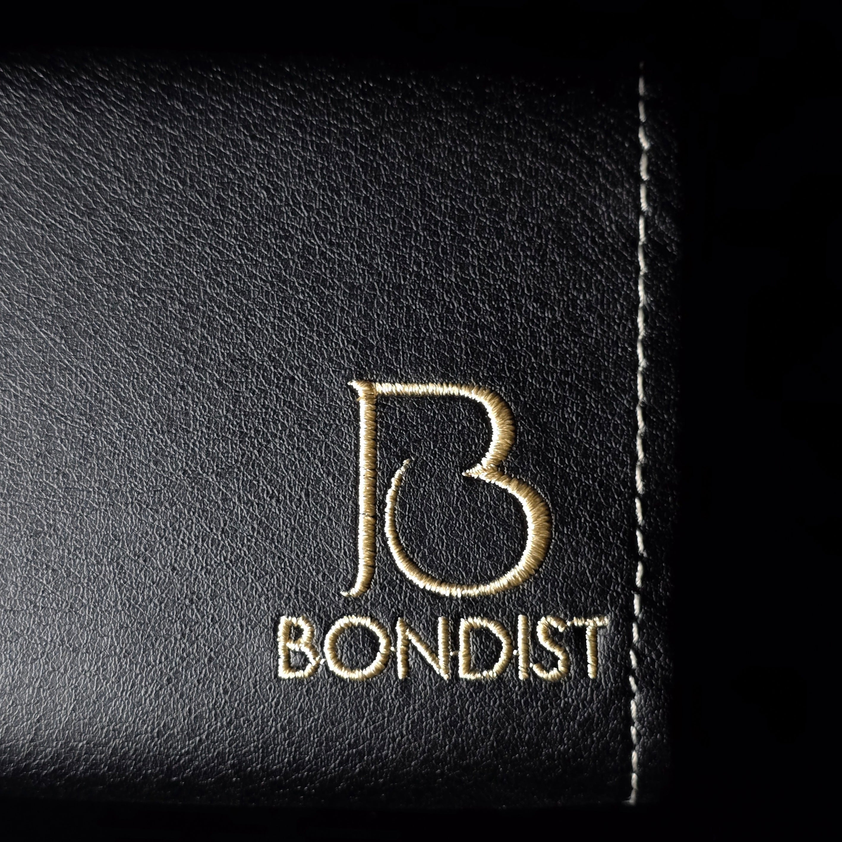 高級感のある黒のレザー調にBONDISTのロゴをゴールドの糸で刺繍がしてあります。